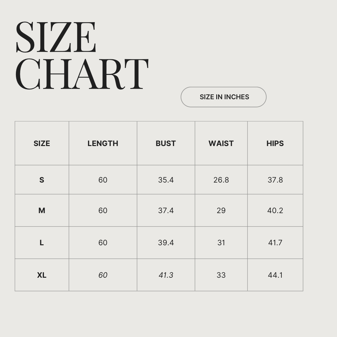 Model’s measurements: Chest 36” · Waist 30” · Hips 42