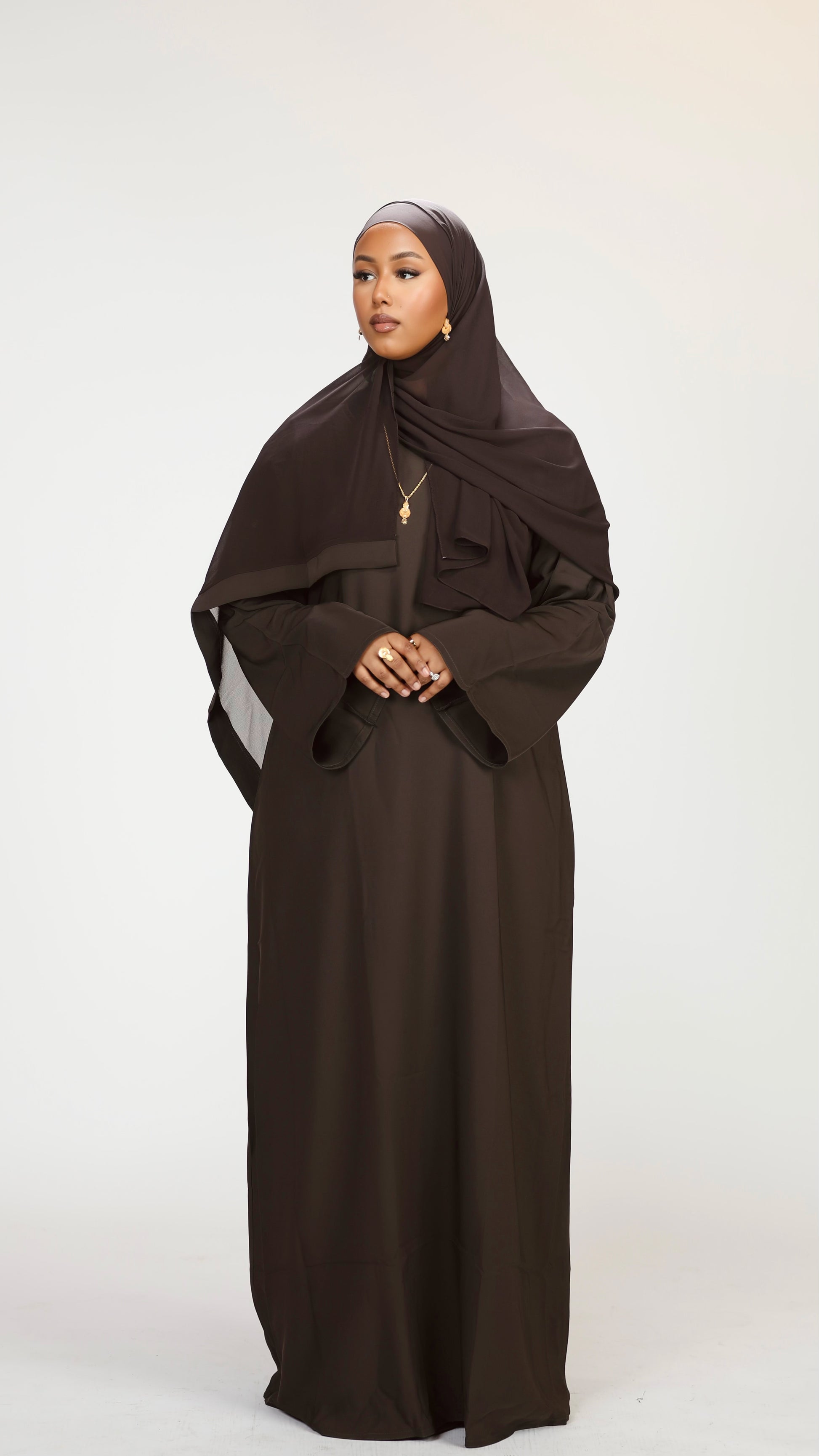 Please note: this abaya does not include a chiffon hijab, but you can easily add our brown modal hijab set at checkout for a complete look.